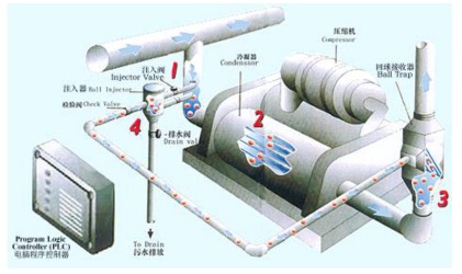 1、電腦程序控制器啟動清洗循環,將注射閥門打開,控制特殊球進入冷凝器循環系統; 2、尺寸比管道稍大的軟質材料制成的特殊球通過冷凝器,將冷凝器管壁上的水垢和污垢帶走; 3、特殊球通過冷凝器后,被回收器接收; 4、電腦程序控制器打開排水閥門,球自動回到球注入槽,槽中的水自動將特殊球進行清洗、排污、排水閥門關閉,完成一次循環。遵此電腦程序每天進行36次循環清洗。 |