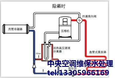 中央空調在制熱狀態下,回熱高壓除霜儲液氣液分離器的外層儲液器中的冷媒始終保持20bar的壓力,所以在采取逆向運行進行除霜的時候,超過15bar的壓差立刻把儲液器中的全部高壓液體冷媒送到蒸發器中,參與制冷除霜循環,所以加速了除霜速度,從而實現快速除霜的目的。常規風冷熱泵機組需要五到六分鐘的除霜時間,采用回熱高壓除霜技術可以把除霜時間縮短到2分鐘。 中央空調回熱高壓除霜技術即彌補了一般單進單出膨脹罐的調節冷媒能力差的缺點,又因回熱高壓除霜儲液氣液分離器的外層儲液器中的高溫液體冷媒將氣液分離器中的冷媒汽化,于是同時達到增加冷媒質量流量和防止壓縮機液擊的雙重效果。 |